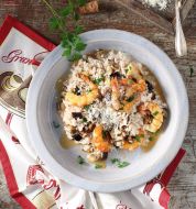 Υλικά (για 6 άτομα) 1 κιλό μέτριες ωμές γαρίδες 2½ φλ. (500 γρ.) ρύζι Arborio για ριζότο 1 μεγάλη ντομάτα τεμαχισμένη 2-3 κλωναράκια σέλινο με τα φύλλα τους τεμαχισμένα 4-5 κλωναράκια μαϊντανό τεμαχισμένα 3 κουταλιές ελαιόλαδο 1 μέτριο κρεμμύδι ψιλοκομμένο 1 φλ. άσπρο, ξηρό κρ [...]