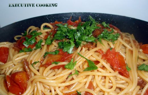 ΥΛΙΚΑ : 500 γρ. σπαγγέτι 10 ντοματάκια σαντορίνης 1 ματσάκι μαϊντανό 1 φλ. ξύδι βαλσάμικο 2 κ.σ ζάχαρη κατα προτίμηση καστανή 3 μεγάλα κρεμμύδια ελαιόλαδο αλάτι πιπέρι ΠΑΡΑΣΚΕΥΗ : Ρίχνουμε σ' ένα τηγάνι κομμένα σε ροδέλες τα κρεμμύδια με λίγο ελαιόλαδο σε χαμηλή φωτ [...]